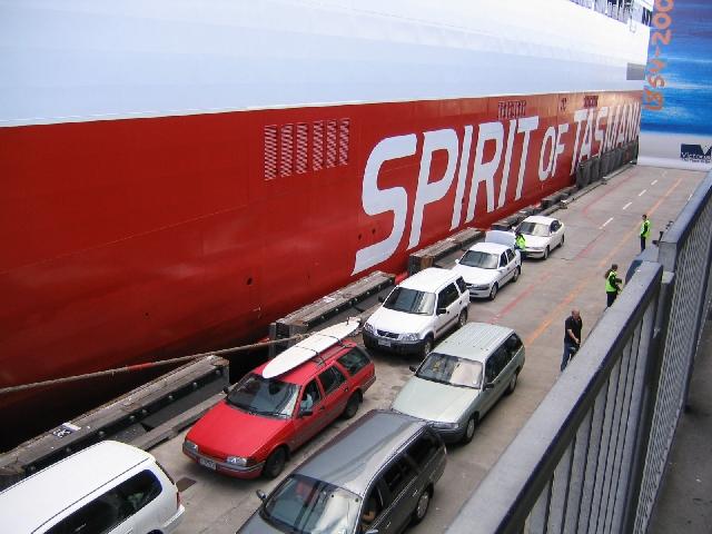 Spirit of Tasmania Stu, Roxanne, Jess, Lise, Max, Louise and Richard on dock. Myself and Em on the boat.